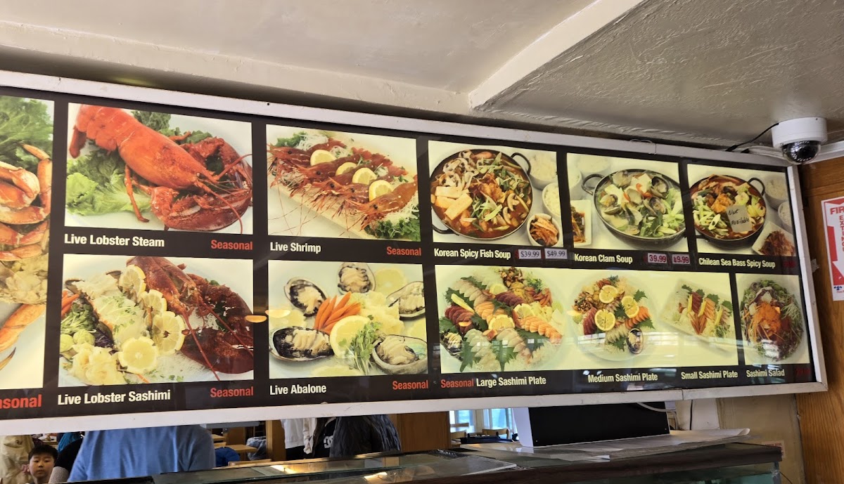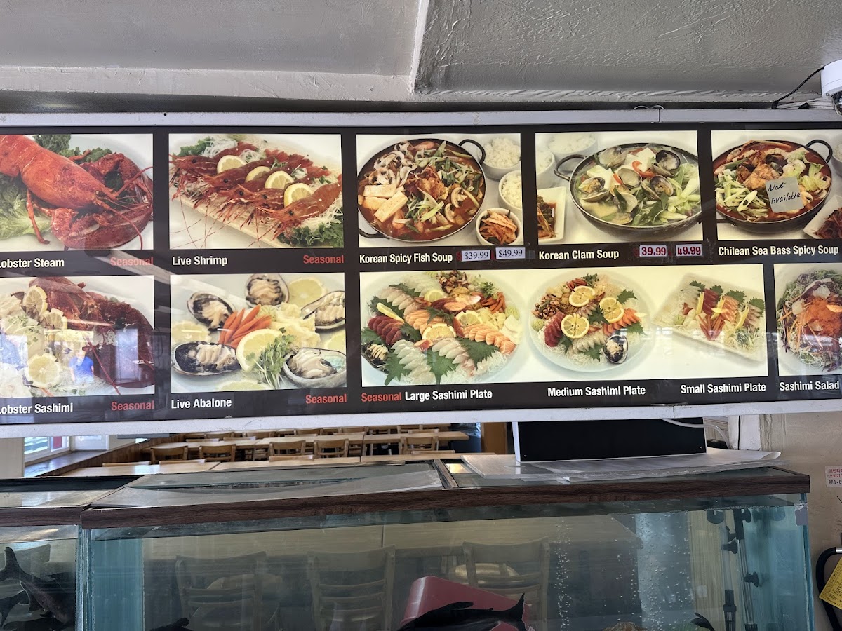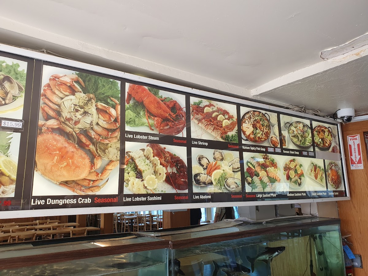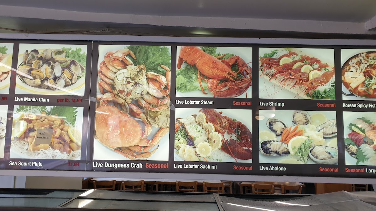The menu at Pacific Fish Center & Restaurant features a variety of seafood options that highlight both live and cooked dishes. The selection includes seasonal live shellfish such as Dungeness crab, lobster, and shrimp, alongside various sashimi plates in different sizes to accommodate different appetites. Soups like Korean spicy fish soup and clam chowder provide warm savory choices, while specialty items such as baby octopus, seafood baskets, and crab legs add diversity to the offerings.