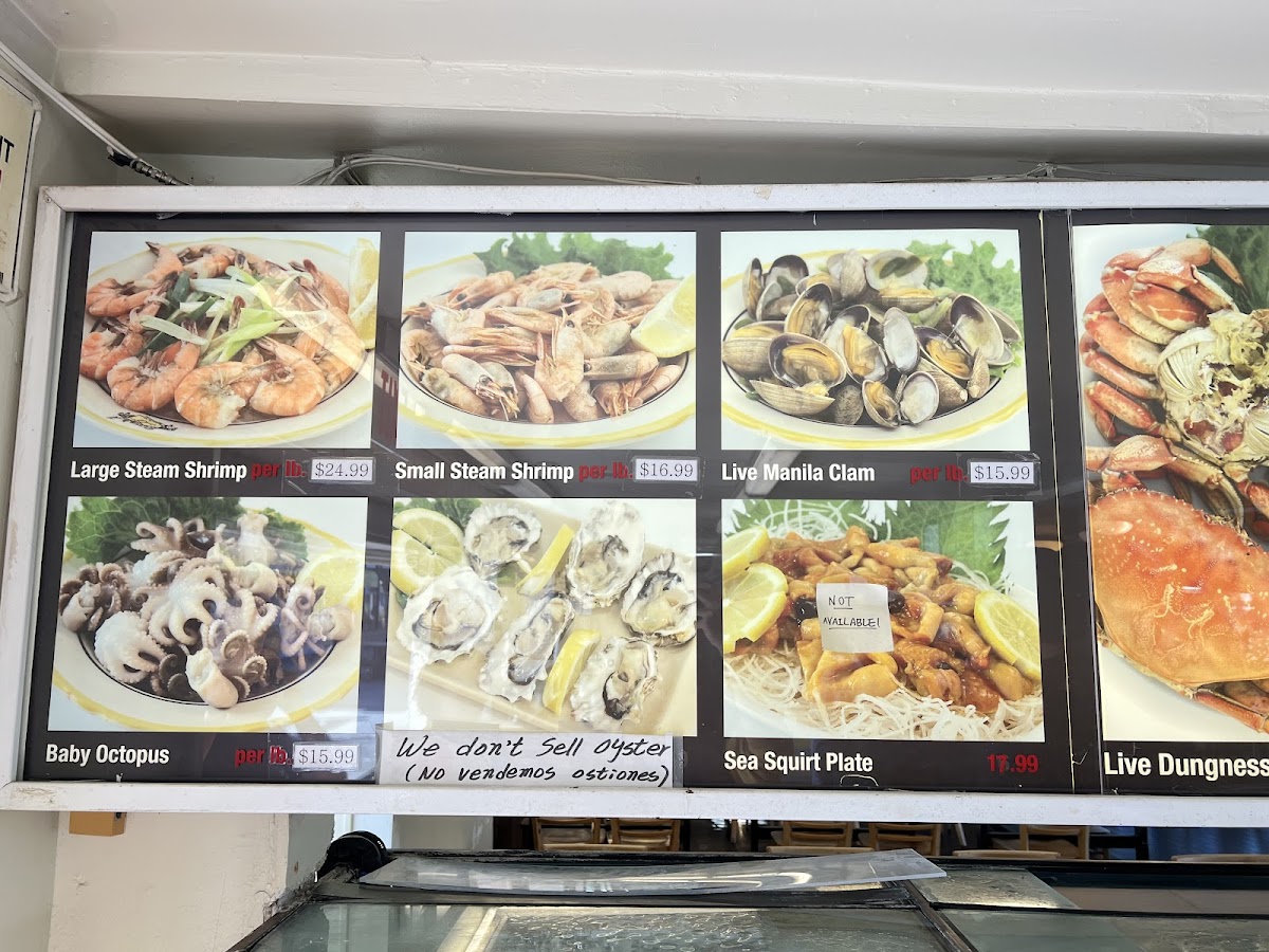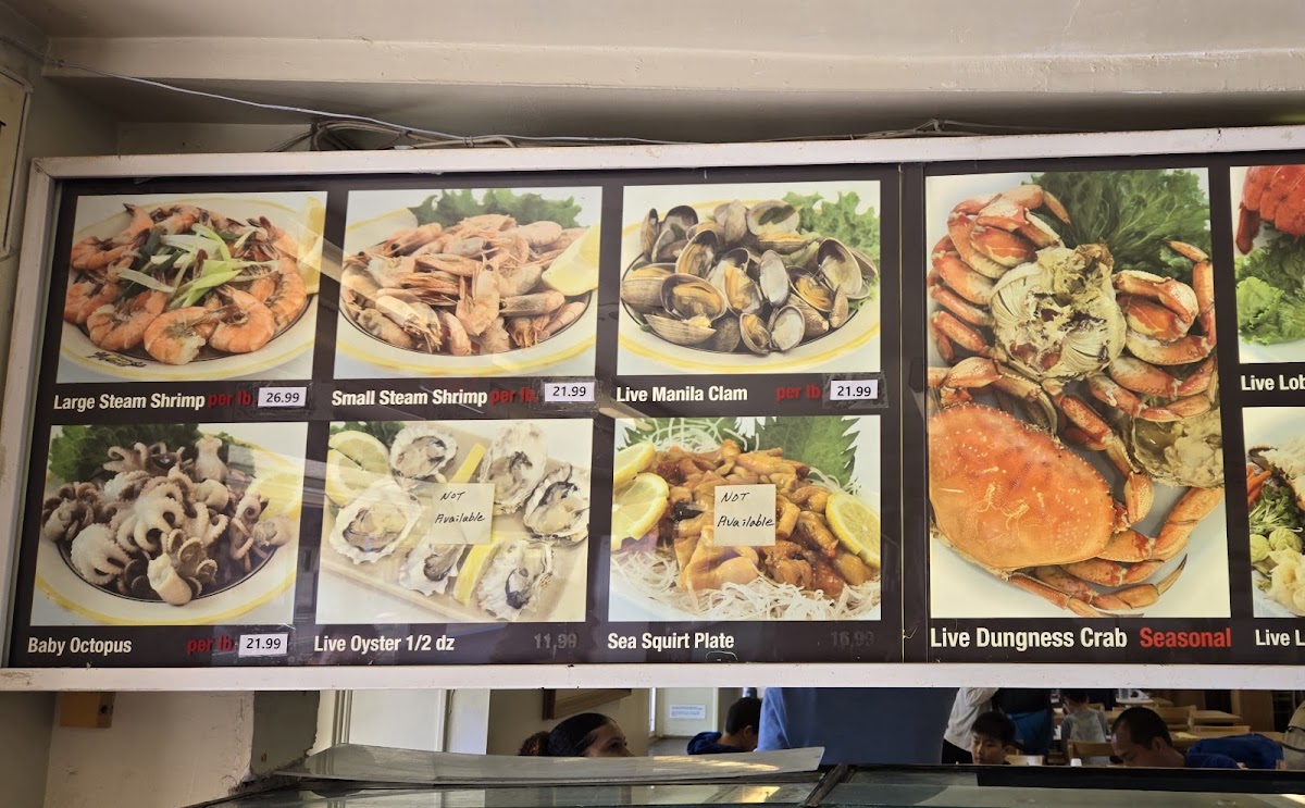 - Live Seafood: Seasonal live lobster, live Dungeness crab, live shrimp, live Manila clams, and live oysters, offering freshly steamed or served as sashimi.